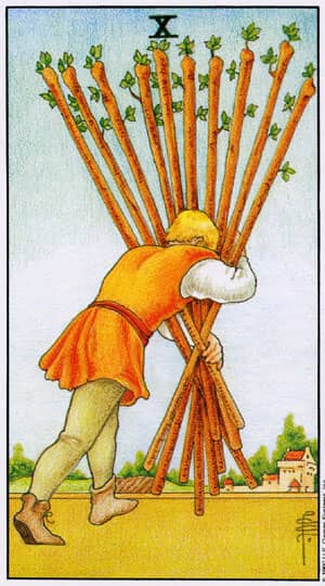 10 buław nazywana jest także 10 kijów lub 10 pałek. Człowieka przytłacza ogrom bolączek, trudności, nacisków i cierpienia. Przykre uczucia oraz nieprzychylne koleje losu towarzyszą podczas wykonywania zaplanowanego celu. Ścieżka do sukcesu zaczyna| niepokoić. Może zjawić się poczucie przeciążenia, umęczenia organizmu. Zauważamy, że tracimy wiarę i motywację do zakończenia zadania. Wielokrotnie dociera do nas poczucie bezsensowności. 10 pałek sugeruje, by przyjrzeć się własnym działaniom i ocenić swoje postępowanie. Może także chcieć zwrócić uwagę na to, że przyjęliśmy na siebie za dużo zobowiązań i nie jesteśmy w stanie podołać oczekiwaniom. 10 pałek wskazuje również na samotną walkę z przeciwnościami losu. Dzieje się tak z własnego wyboru.