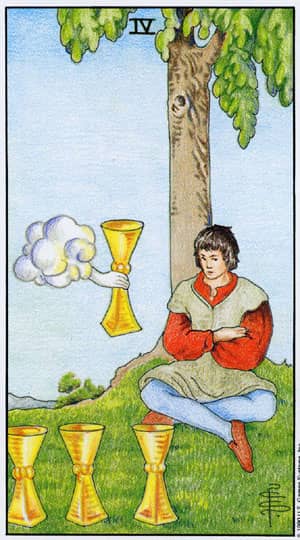 4 pucharów wskazuje wycofanie się. My bądź osoba, która nas zainteresowała, odczuwa awersja do stworzenia nowego związku bądź też żyje wspomnieniami, przeżywając je na nowo. Karta sygnalizuje także rozterki miłosne, rozczarowanie znajomością, niepewność co do uczuć, a nawet znużenie.