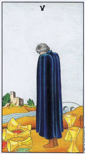 5 kielichów nazywana jest także 5 pucharów. Człowiek czuje się skrzywdzony i nie może pogodzić się z rzeczywistością. Jego przeświadczenia, to czego oczekiwał oraz głęboko chciał, były jedynie iluzją utopią. Przestał dostrzegać pozytywne strony sytuacji, a skupia się tylko na bólu. Rozmyśla, rozważa, roztrząsa, skarży się i odczuwa wewnętrzny ból. Wszystko postrzega negatywnie – w czarnych barwach. Osaczył go pesymizm oraz zupełny brak nadziei na lepsze jutro. 5 kielichów stara się nam przekazać, że świat nie jest wyłącznie czarny. Musimy nauczyć się dostrzegać pozytywy nawet w najtrudniejszym etapie życia. Nic nie jest czarno białe. Zazwyczaj rządzi szarość. Szary z kolei to mieszanina bieli (pozytywny wymiar) i czerni (negatywny wymiar).