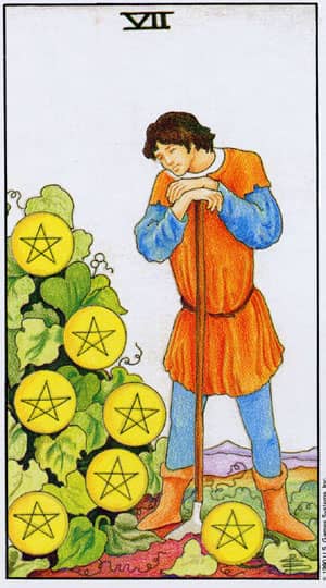 7 monet nazywana jest również 7 denarów. Odzwierciedla sytuację, w której człowiek ukończył przedsięwzięcie. Przelał w nie całą swoją siłę oraz poświęcił czas. Nadszedł czas, w którym zostało mu jedynie czekać na pojawienie się pierwszych efektów. Należy oddać sytuację w ręce wszechświata oraz pozwolić mu dokonać dla nas zmian. Nierzadko towarzyszy temu poczucie bezsilności. Karta aczkolwiek ewidentnie pokazuje, że nic więcej nie można zrobić. Człowiek psychicznie przygotowany jest na pozyskiwanie korzyści ze swoich sukcesów. Jednak 7 monet namawia do tego, aby przyjrzeć się następstwom pracy i dokonać słusznej oceny. Naturalnie tylko wtedy gdy odczuwamy, iż jest to niezbędne.
