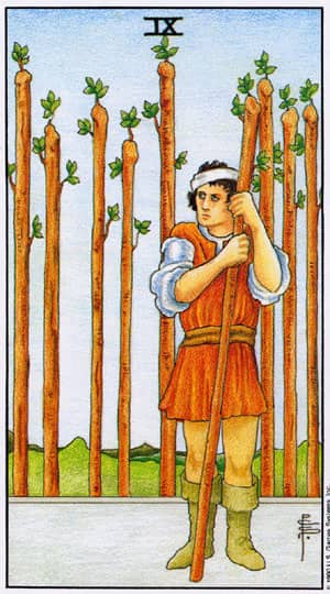 Nowa sytuacja, która stanie się brzemieniem nie do udźwignięcia. Możemy odnieść porażkę usiłując sprostać problemowi. Może to być wydarzenie, które jest dla nas niemożliwe do zaakceptowania. Nie znajdujemy rozwiązania, ani też nie mamy odpowiedniej wiedzy, aby dojść do sedna sprawy. 9 pałek sugeruje, że ujawni się wstręt do nabrania motywacji, by zmierzyć się z kłopotami.